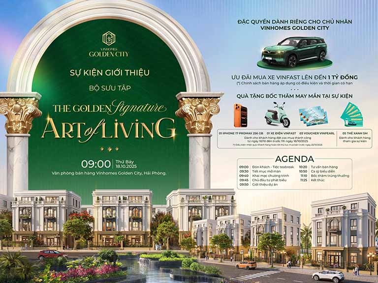 Sáng ngày 18.10, thị trường bất động sản Thành phố Cảng đã hoàn toàn “dậy sóng” với sự kiện ra mắt Bộ sưu tập The Golden Signature. Diễn ra trang trọng tại Văn phòng Bán hàng Vinhomes Golden City – Hải Phòng, sự kiện không chỉ là buổi giới thiệu, mà là lễ “hé lộ” những thông tin đắt giá, độc quyền về tuyệt phẩm đầu tư này.